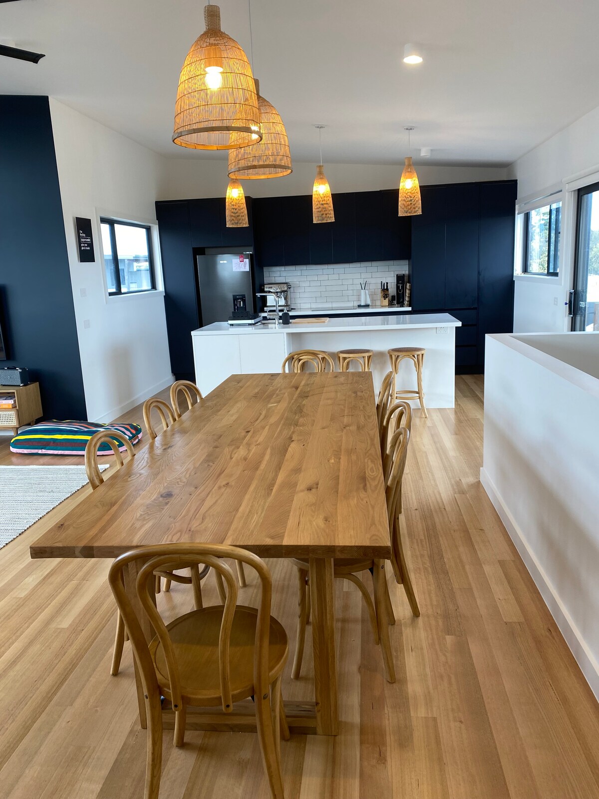 The Rennison - це унікальний архітектурний будинок, розташований на березі Західного Портового затоки в Ньюхейвені, острів Філіп. Цей будинок, побудований за допомогою грязьового цегли та переробленого тасманського дуба, легко поєднується з природним оточенням. Високі стелі та вікна від підлоги до стелі забезпечують достатнє природне освітлення, щоб затопити простір, створюючи спокійну та привабливу атмосферу.