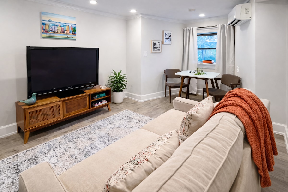 Приватна англійська квартира на цокольному поверсі з повнорозмірними вікнами та 8-футовими стелями • Передній і задній окремий вхід із входом без ключа • Відкритий патіо (спільний простір) • 1 ліжко queen-size • Засоби для бездротових Інтернетів • Інтелектуальний телевізор з Netflix • Повна кухня з газовою плитою • Кофемашина Nespresso та електричний чайник • Свіжі рушники та білизна на 4 персони • Пральна машина/сушильна машина • 2 гостя - це оптимальний варіант, але третій гість, безумовно, може спати на дивані за бажанням
