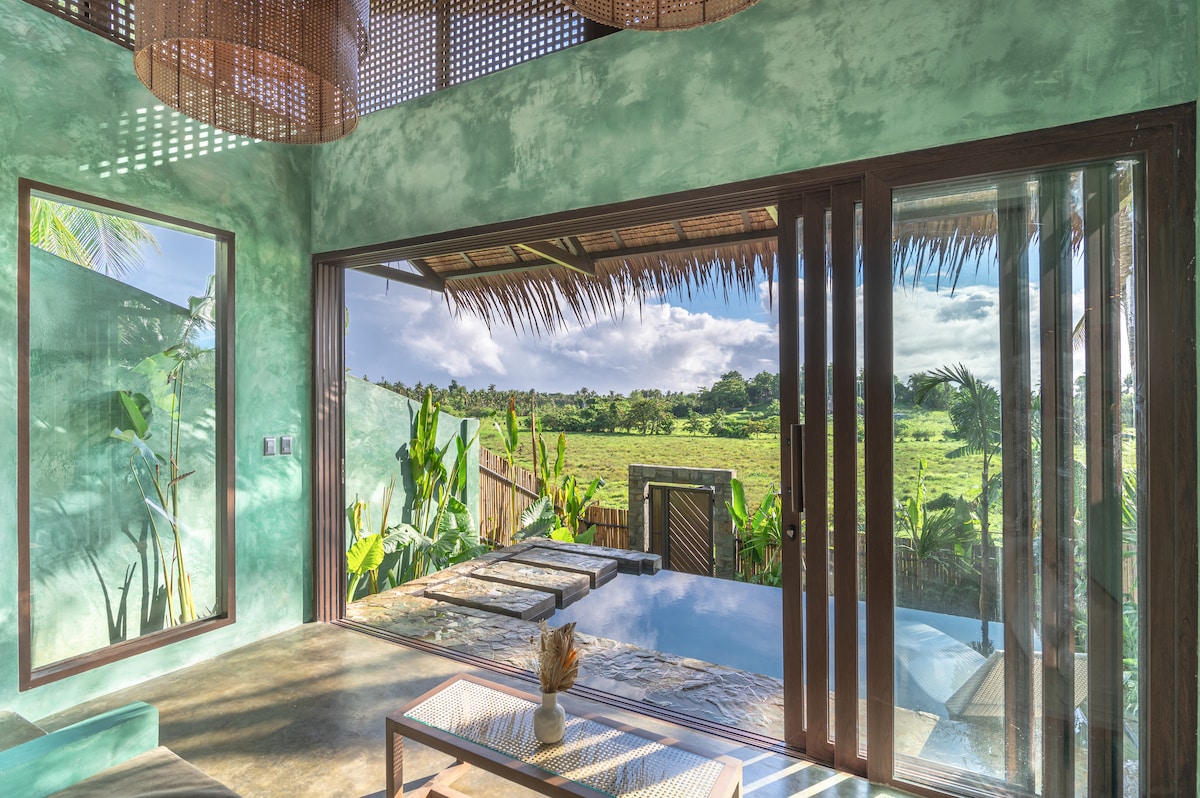 Ця приватна вілла з 1 спальнею розташована на пагорбі в центрі міста Генерал-Луна, Сіаргао, звідки відкривається чудовий вид на рисові поля та пальми, але всього за кілька хвилин від центру міста. Відпочиньте в приватному безбортному басейні, насолодіться краєвидами та розкішним облаштуванням, яке зробить ваш відпочинок по-справжньому особливим. Ми знаходимося в 3 хвилинах ходьби від знаменитої хвилі Cloud 9 і в 5 хвилинах ходьби від головної дороги з більшістю ресторанів. Наша вілла обладнана генератором електроенергії.