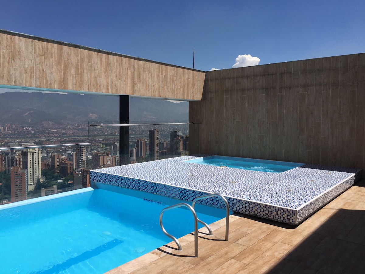 Luxury stay in Energy Living Medellín most iconic building. Private balcony with jacuzzi and open city & mountain views. Prime location just minutes from Provenza. • Private balcony + jacuzzi • Separate living room & bedroom • Queen bed + AC • Spacious layout (1,000 sq ft) • Fast WiFi – ideal for remote work • Rooftop pool with panoramic views • Jacuzzi, steam room & gym • Restaurant / bar lounge + room service • 24/7 security & front desk