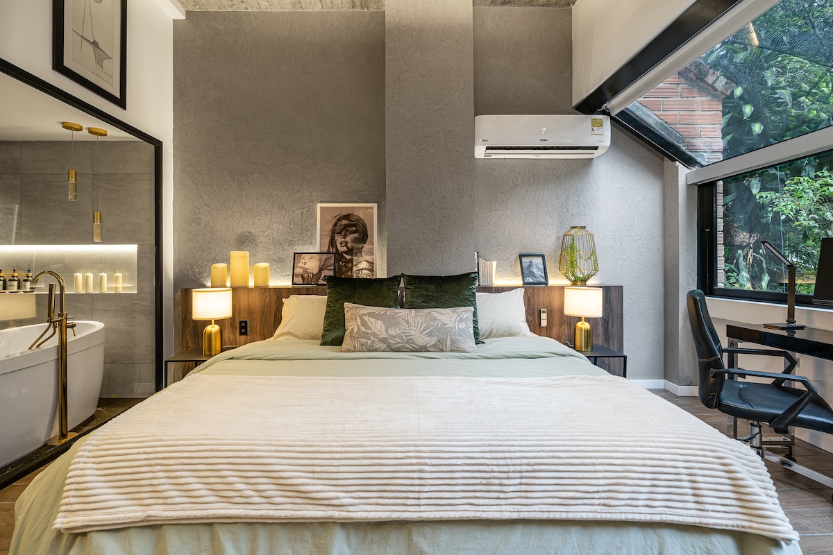 Насолоджуйтеся перебуванням у Медельїні в цій ексклюзивній студії з приватним джакузі, великим двоспальним ліжком, кондиціонером і захоплюючими краєвидами на місто – ідеальне місце для відпочинку, елегантності, комфорту та яскравого нічного життя. Розташований в Ель-Побладо, за декілька кроків від ресторанів, барів на даху, кафе та галерей Провенси, а також за декілька хвилин від нічного життя Парку Льєрас. Насолоджуйтеся 54-дюймовим смарт-телевізором із Netflix, високошвидкісним Wi-Fi, кухнею, пральною машиною/сушаркою, тренажерним залом, сауною, басейном, барами, ресторанами та галереєю на території.