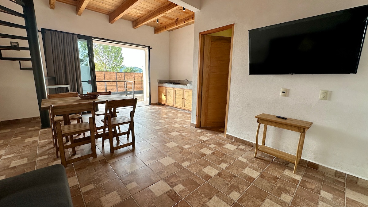 Це дивовижний котедж у саду авокадо. Розташований в Сан-Хуан-Атескапан неподалік від Валле-де-Браво. Він ідеально підходить для відпочинку та відпочинку в місті, для відпочинку та від 'єднання. Він встановлений на два квартали. З одного боку розташовані громадські приміщення, вітальня, їдальня, кухня з ванною кімнатою та бар зі сніданком на відкритому повітрі. Відразу з одного боку розташовані місця для відпочинку. Головна спальня з ліжком размера King size, шафою, терасою та власною ванною кімнатою.
