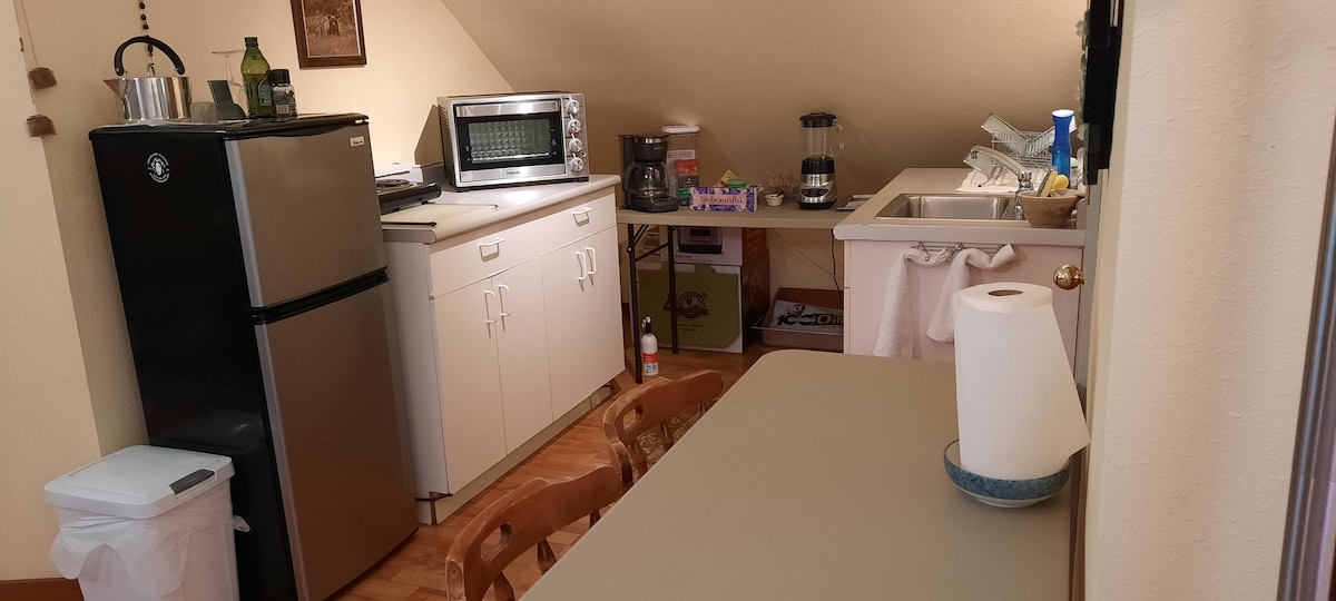 Чарівна площа 250 кв. футів Бунгало Південного Юджина в гостьовому лофті з приватним зовнішнім входом (10 сходинок вгору), ідеально підходить для 1 гостя. Повна окрема ванна кімната з раковиною, туалетом та душем.* Ліжко в шафі розміру Queen size з зручним матрацом з пінопластом, бамбуковий чохол, якісна білизна. *Хоча висота стелі ванної кімнати становить 7 футів 6дюймів на найвищому рівні, зверніть увагу, що кутові стелі в душовій можуть забезпечувати простір для гостя з високої сторони. Душова головка знімна/ручна для додаткової зручності.