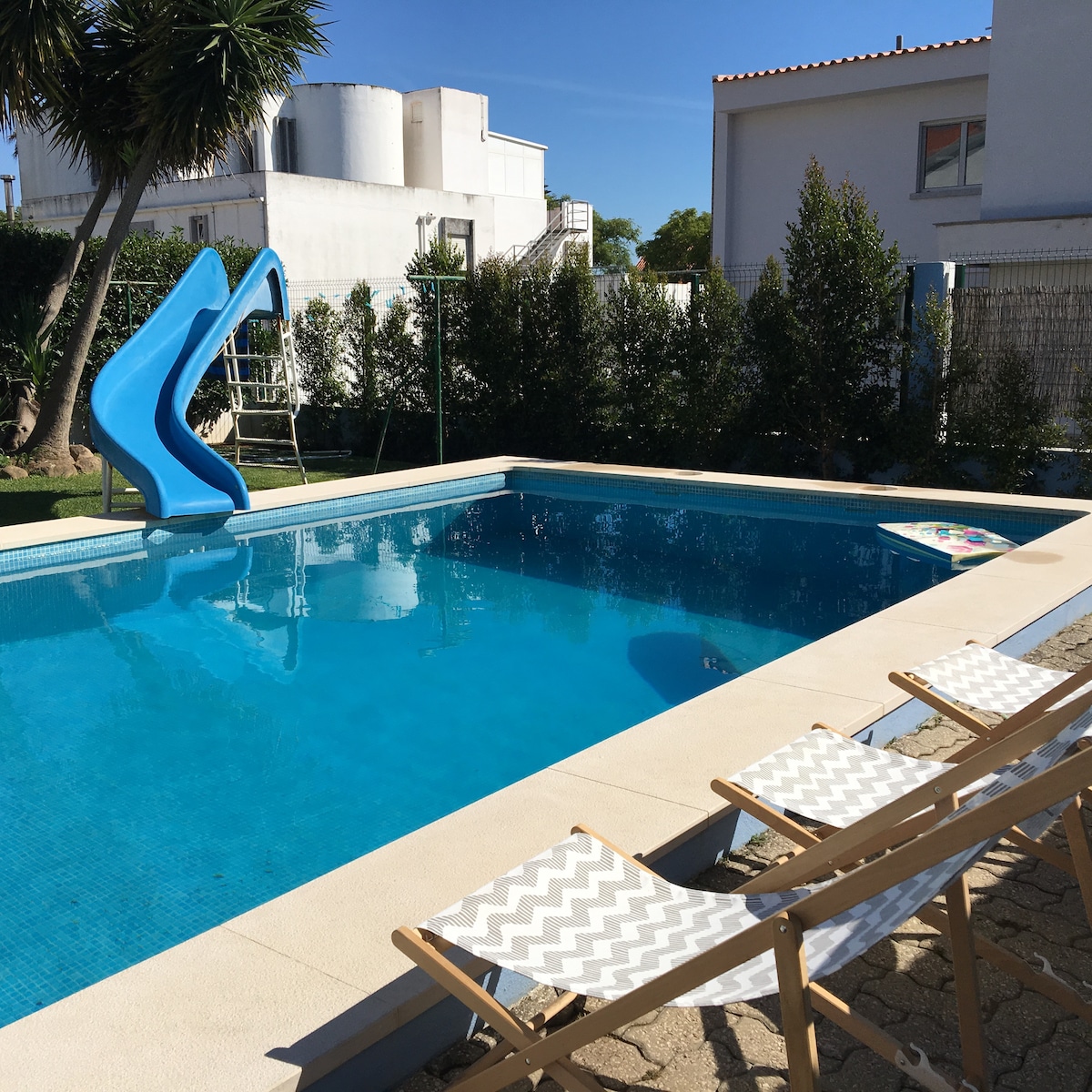 Новий басейн з покриттям і солоною водою (3,5 м * 7 метрів ) Наш будинок повністю відремонтований з новими меблями в сучасному вінтажному стилі. Будинок оточений прекрасним садом з багатьма різними ділянками, включаючи їдальню з грилем та садовими меблями. Всього 4 зручні кімнати з 3 балконами, 3 туалетами та однією терасою площею 30 м2, підготовленою для купання на сонці, гараж. У вас є магазини, відпочинок і автобусна зупинка менш ніж за 5 м від вас. Потяг, який зв 'яже вас з Лісабоном і Кашкайшем, знаходиться на відстані 1200 м.