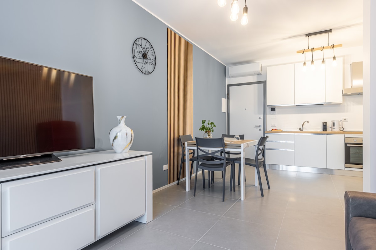 Світла сучасна квартира з дизайнерськими стінами та елегантними меблями, ідеально підходить для тих, хто шукає комфорт та практичність. Простора спальня з двоспальним ліжком, обладнана кухня, затишна вітальня та доглянута ванна кімната. Швидкий Wi-Fi, телевізор із плоским екраном і кондиціонер. Район тихий, але добре обслуговується: супермаркети, ресторани та швидке сполучення з Міланом знаходяться всього за декілька хвилин. Ідеально підходить для пар, сімей або ділових поїздок.