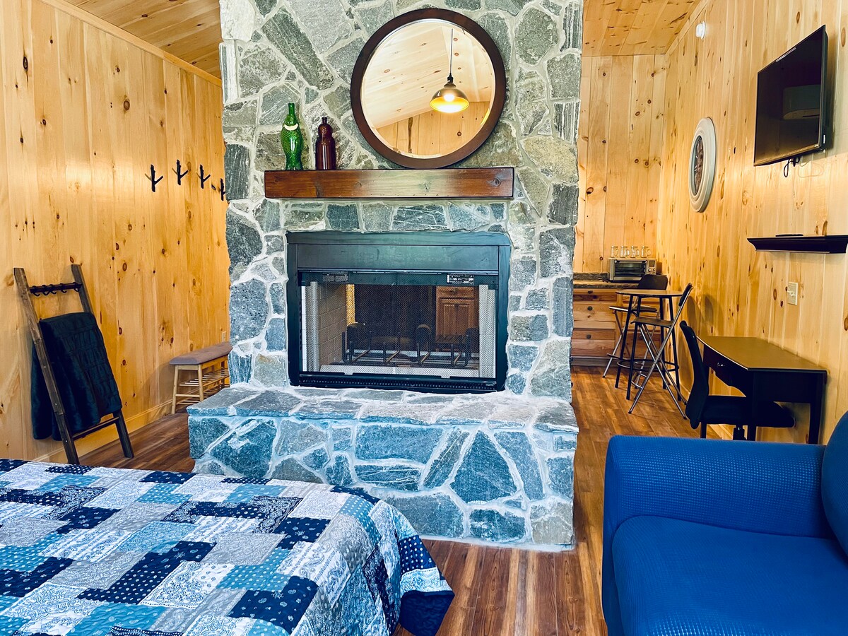 • Perfect for small families or couples, our signature A-Frame cabin features a modern interior gas burning fireplace, soaring ceilings, huge windows, stylish interiors, and all the comforts of home. • This cozy 1,100 square foot space comfortably accommodates up to four guests in two bedrooms (one with a King-size bed and the other with a Queen-size bed) and a shared bathroom. • 7 minute drive to downtown Freeport. • Proud to be ranked in the top 1% and voted Guest Favorite!