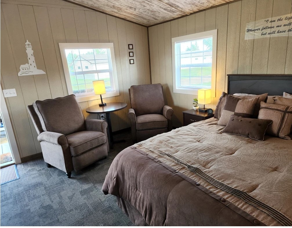 Вона красиво облаштована двоспальним ліжком, зручними кріслами, столом і стільцями, а також мікрохвильовою піччю, холодильником і кавовим сервісом. Розкішна ванна кімната з безлімітною гарячою водою та душем. Наші зруби доступні цілий рік. Ми надаємо постільну білизну/рушники. Ми не надаємо послуги з прибирання, якщо перебування триває менше тижня. У такому разі ми випраємо білизну/рушники та приберемо все помешкання, а також стягнемо додаткову плату в розміром 25 доларів США. Продовжені перебування будуть відповідати тому самому тижневому графіку.