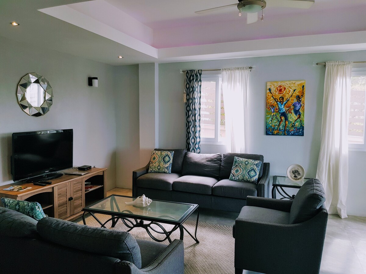 Просторий, спокійний і приватний прихисток із видом на Карибське море. Приголомшливе розташування. Ідеальне розташування, щоб легко дістатися на північ, південний схід або захід від острова. Цей люкс з однією спальнею дуже просторий і має приватну терасу з видом на океан і тропічні сади. Велика вітальня та їдальня на відкритому повітрі, повністю обладнана кухня та доступ до приватного басейну. Великий басейн використовується виключно гостями квартири. Близько до громадських пляжів, ресторанів і курортів.