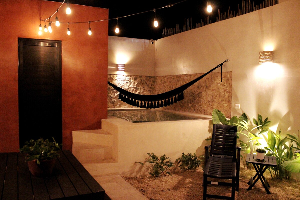 Приватний будинок із чудовим балансом колоніального та сучасного. Ідеально підходить для однієї-двох людей, які насолоджуються життям у приміщенні/на відкритому повітрі. Будинок має дивовижний потік повітря з 16-футовими стелями та спальнею з кондиціонером. Патіо та приватний басейн роблять будинок ідеальним прихистком від метушні та метушні центру міста. Всього в 1 кварталі від парку Ла-Планча, нового «Центрального парку» Меріди та в 2 кварталах від початку вулиці 47 Ruta de Gastronomia, нещодавно пішохідного ресторанного району.