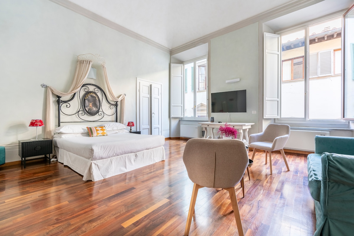 Квартира для двох осіб в історичному центрі Флоренції, всього в 10 метрах від Віа Торнабуоні. Розташований на першому поверсі старовинної будівлі, простір розділений ванною кімнатою з душем, повністю обладнаною кухнею з їдальнею та спальнею з двоспальним ліжком на мезоніні над вітальнею. Завдяки центральному розташуванню до всіх основних атракціонів, пам 'яток і музеїв міста легко дістатися пішки, а також численних магазинів і ресторанів.