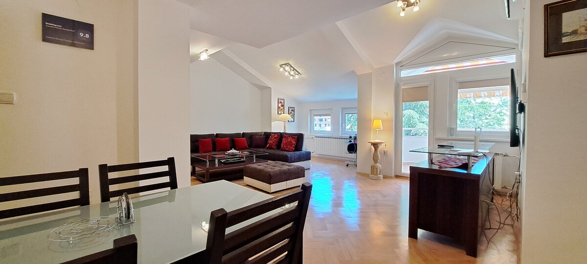 Ця простора квартира з відкритим простором на 2 поверхах дарує відчуття перебування в елегантному будинку, хоча вона знаходиться в будівлі в центральній частині Скоп'є. Завдяки 3 спальням, 2 ванним кімнатам з душовими кабінами, великій вітальні, чудовому балкону та 2 коморам помешкання підходить для бізнес-мандрівників, сімей, а також групи друзів до 7 осіб. Це 15 хвилин пішки до центральної площі Скоп'є. Розташоване в будинку на дуже тихій і безпечній вулиці.