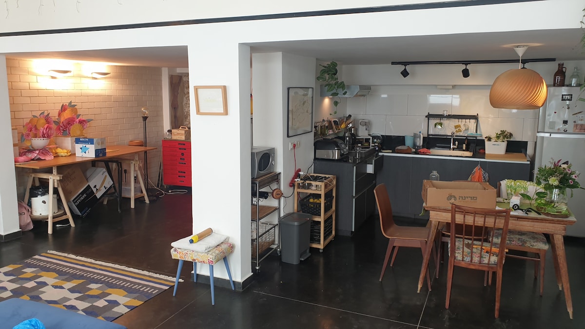 Квартира-студія, оформлена в міському індустріальному стилі, з розкішним і величезним приватним дахом, який використовується лише для квартири. Ідеально підходить для груп, сімей, соціальних зборів, майстер-класів, прийому шеф-кухаря, днів народження тощо. Відкрийте для себе Тель-Авів з іншого ракурсу — інтимність та унікальність, яких ви не знайдете в стандартному готелі. Для бронювання для більш ніж 7 осіб, будь ласка, зв’яжіться з нами.