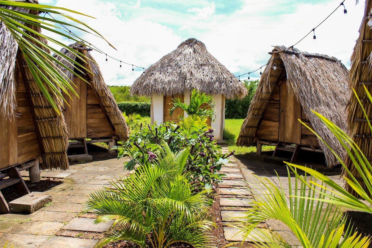 Acogedoras cabañitas tipo chalé, equipadas con una confortable cama que te permitirá disfrutar de una impresionante vista al parque eólico de los Santos, montañas de Casamata, la Lucha, San Cristóbal sur, Frailes.. etc.. cada una cuenta con su servicio sanitario y ducha con agua caliente.. La vista, la paz y el canto del viento harán que nunca olvides tu estancia en este lugar romántico y memorable.