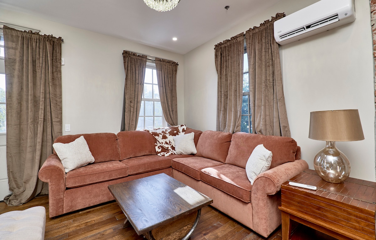 Апартаменти на третьому поверсі з видом на річку з залізничними коліями всього в декількох кварталах. На облаштування стелі знадобилося 2 місяці. Ретельно відполірована і розміщена на старій латі в конкретному дизайні, стеля є витвором мистецтва. Вісімдесять відсотків матеріалів, які використовуються в цій кімнаті, виготовлені з перепланованих дерев 'яних виробів, з цієї будівлі або з дитячої стодоли, побудованої наприкінці 1800-х років. Вам знадобиться деякий час, щоб помітити кожну деталь до тримача туалетного паперу, який знаходиться зі старої стодоли.