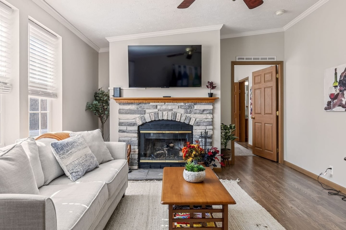 Без плати за прибирання! Відпочиньте в цьому затишному зрубі на фермі площею 30 акрів із прекрасними краєвидами та спокійним оточенням. Поруч магазини, виноробні, нічне життя, полювання та риболовля. Велика кількість диких тварин і сільськогосподарських тварин - коні, корови, курчата, кози, вівці, гуси. Дві спальні (одна в просторому лофті) з диваном queen-size у вітальні. Повноцінна кухня з посудомийною машиною. Камін і соборні стелі у вітальні. Повна ванна кімната з душем. Критий передній ганок. Екран біля вітальні з місцями для відпочинку на вулиці. Яма для багаття.