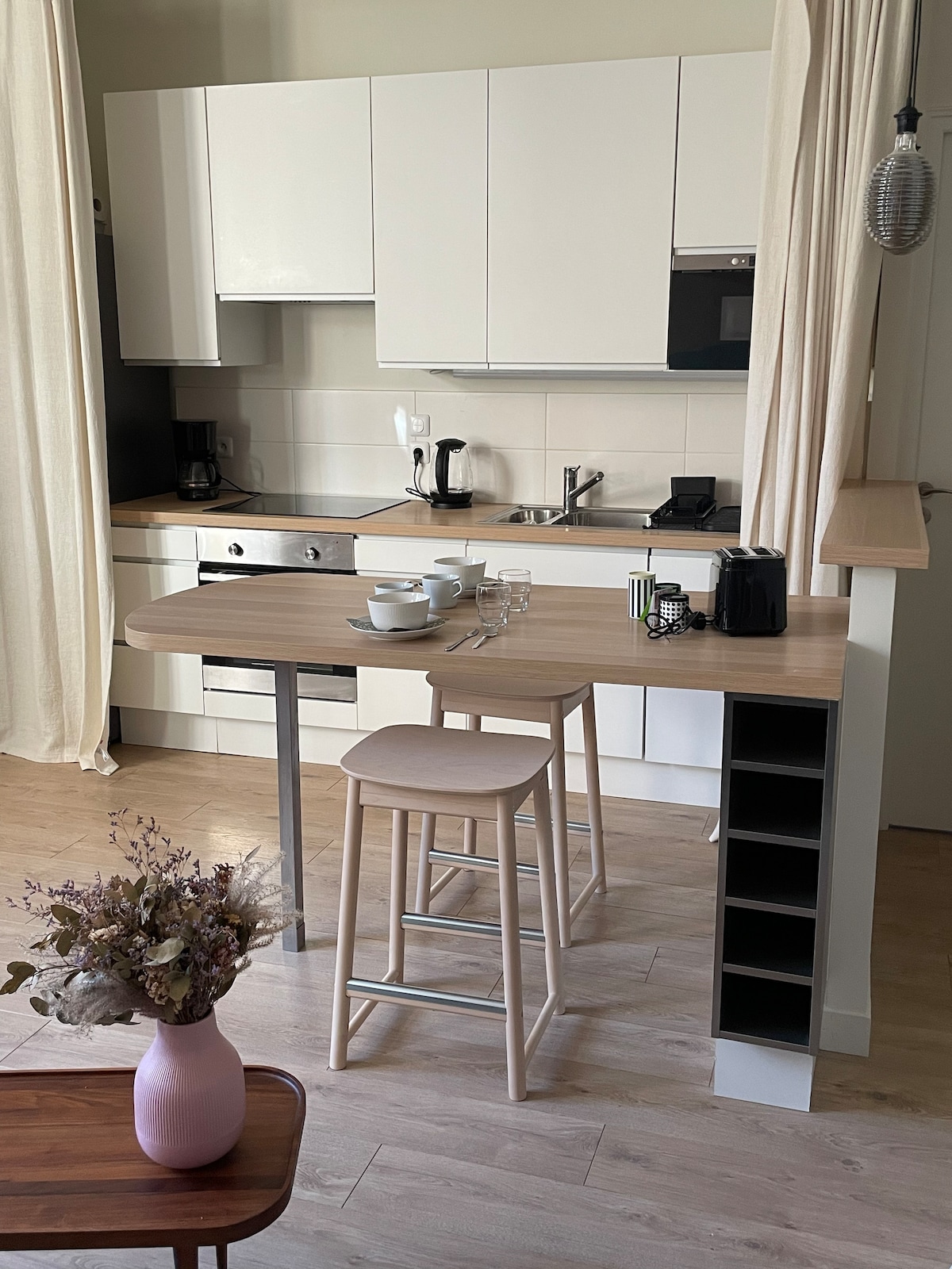 Насолодіться перебуванням у Ренні в цій прекрасній квартирі площею 41 кв. м, повністю відремонтованій у 2022 році. У самому центрі Ренна, на площі Сент-Анн, перед монастирем Якобінців, ви можете насолоджуватися всіма зручностями, які пропонує місто. Багато ресторанів також знаходяться неподалік від помешкання. Знайте, що квартира знаходиться на 3-му поверсі старовинної будівлі і пропонує дуже гарний вид на площу. Кімната з боку двору дуже тиха. - Мебльована кухня.