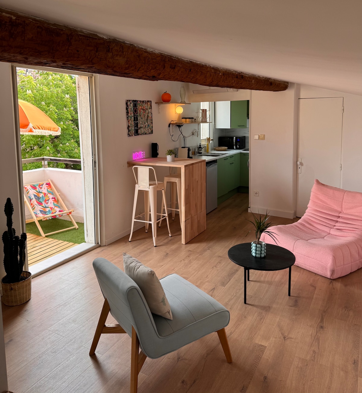 La Maison sur les Toits in Aix-en-Provence площею 22 м2 (T1) розташований на четвертому поверсі в популярному районі: Villeneuve. Тихий, сонячний, розташований на дахах міста. Помешкання La Maison sur les Toits складається з спальної зони з двоспальним ліжком (Futon Bio виробництва у Франції), душової кімнати, повністю обладнаної кухні та їдальні.