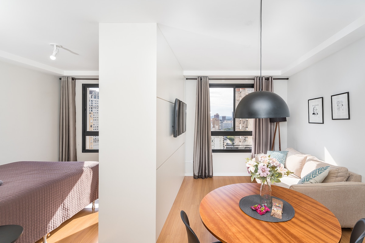 Studio na melhor localização de Curitiba, o bairro do Batel. Prédio recém entregue, com toda infra estrutura para uma estadia perfeita. Não possuímos vaga de garagem. Indicamos o estacionamento ao lado do prédio que funciona 24 horas.