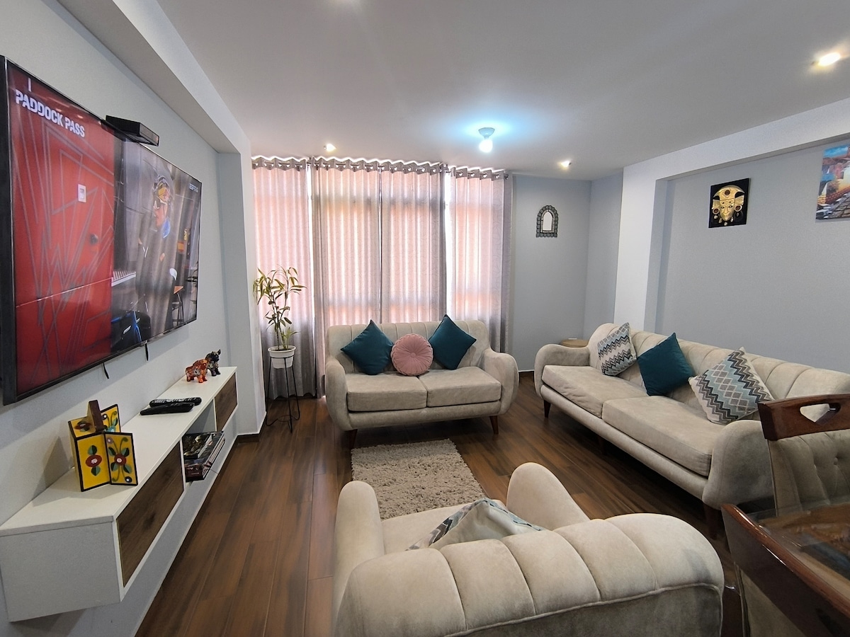 Затишна і простора квартира в Куско з панорамним видом. Ідеально підходить для 6 гостей, має 3 спальні з телевізором та обігрівачами (необов’язково), 2 повні ванні кімнати, вітальню, їдальню, повністю обладнану кухню, пральню та Wi-Fi. Гаряча вода 24/7. Розташована на 5-му поверсі (без ліфта). Паркінг доступний. Всього в декількох хвилинах від історичного центру — ідеально підходить, щоб насолодитися Куско в комфорті та спокої.