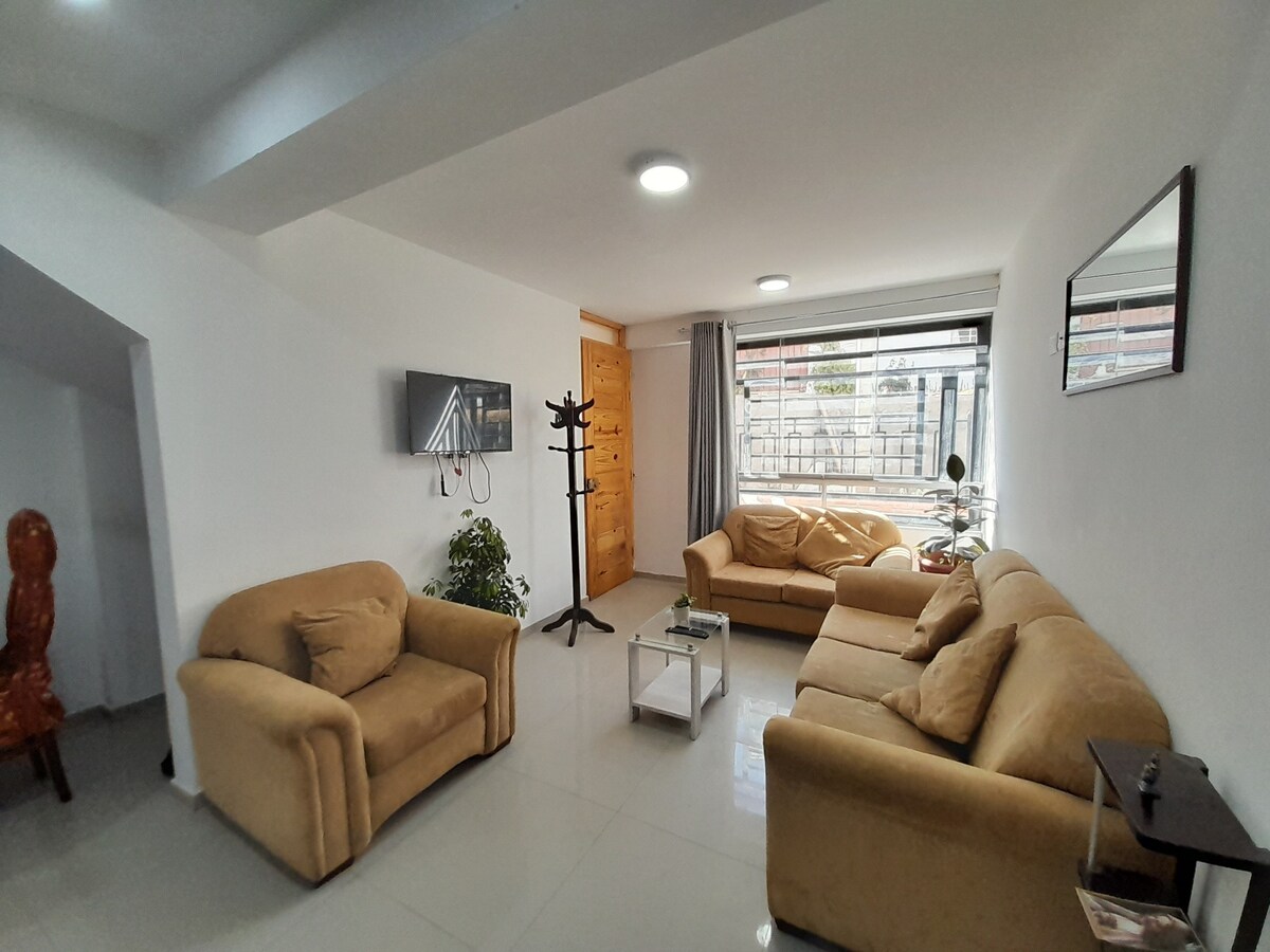 El depártamento se encuentra ubicado en el tercer piso y cuenta con sala, comedor, cocina , zona de entretenimiento y lavanderia y cuenta con 2 dormitorios, todo el departamento tiene luz natural a los dormitorios con ventanas amplias , el departamento es independiente y amoblado, el dia que arrivan a cusco les recojemos del aeropuerto o terminal terrestre para trasladarlos y darles las llaves . pueden hacer uso de la terraza que tiene una linda vista de la ciudad.