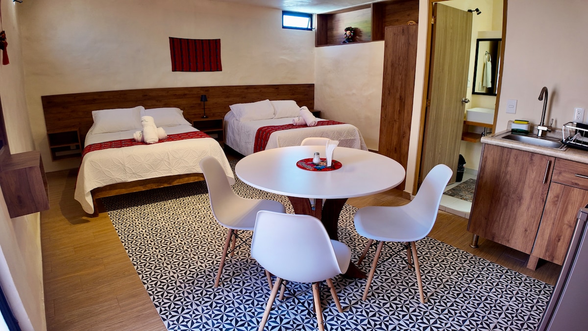 Departamento completo ideal para disfrutar tu estancia en Qro. Habitación muy amplia, cuenta con mini split, TV, clóset, 2 silloncitos y espejo de cuerpo completo. La cocina está equipada con: parrilla eléctrica, microondas, licuadora, cafetera, refrigerador, vajilla para 4 personas, y accesorios básicos para uso de la cocina. 1 baño completo (se utilizan paneles solares para el agua caliente), incluye: jabón para manos, shampoo, jabón corporal, toallas, secadora p/cabello y plancha p/ropa