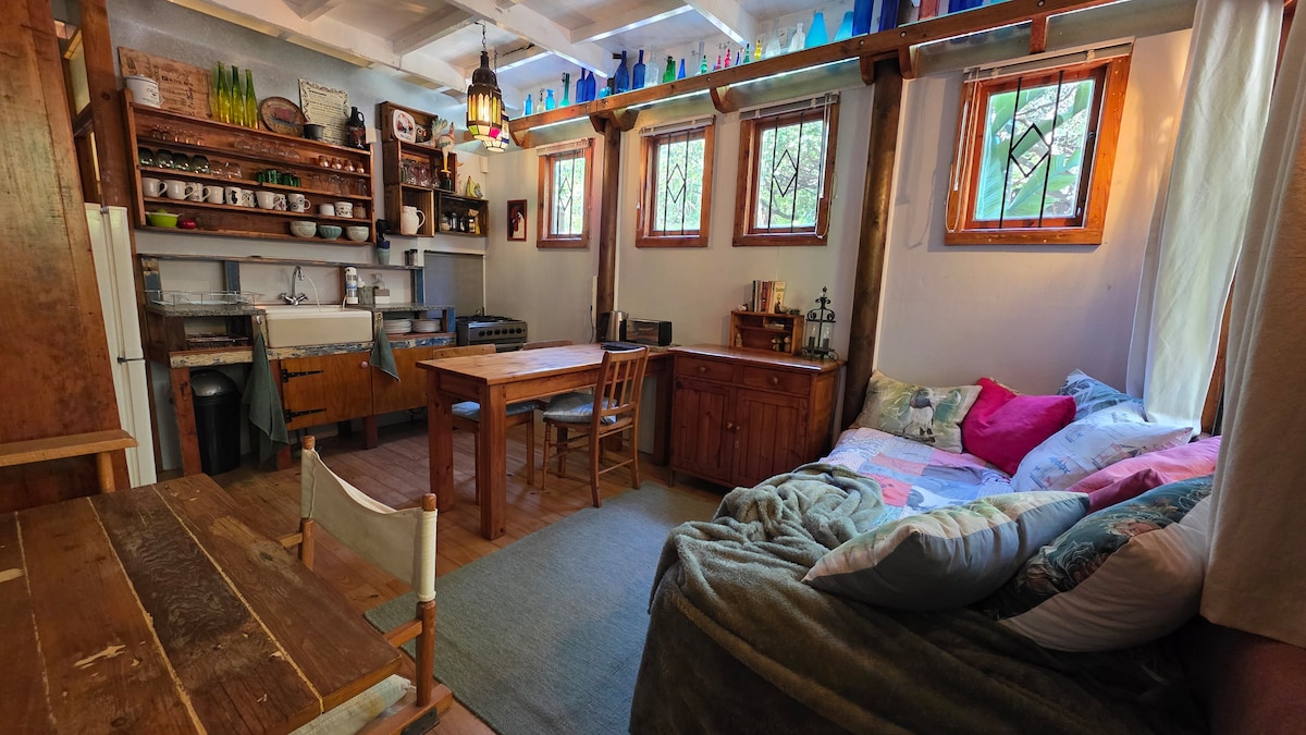 Stay at Cyphia Close Cabins in Hout Bay, in a unique, architect designed pod with magnificent outdoor spaces, sea & mountain views, surrounded by beaches, sand dunes, mountains & fynbos, while still close to town & CBD Featuring a twin/king bed(s), bathroom, living area, kitchen, deck & wood-fired outdoor bath Internet:500MB down/250MB up. Inverter for loadshedding Not secluded; we have other cabins and we have animals onsite No free stays for social media posts Please read full listing