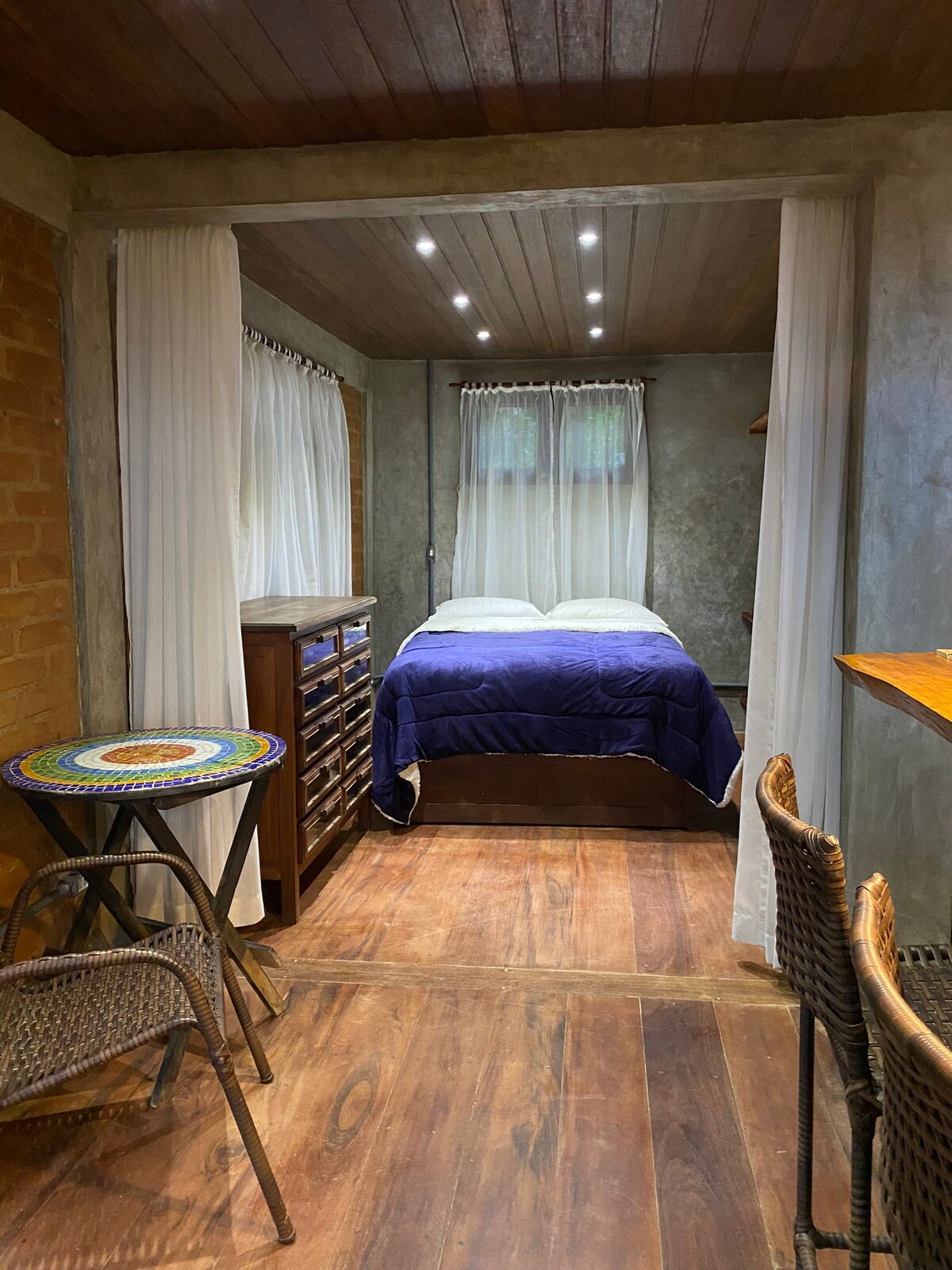 Цей абсолютно новий будинок розташований високо над деревами в екологічному селищі Aldeia Rizoma, закритому помешканні в 15 хвилинах ходьби від історичного центру міста. У помешканні є тренажерний зал у джунглях, сауна (за додаткову плату), приватні стежки та доступ до 5 приватних водоспадів. Студія з однією спальнею має ліжко розміру «king size», побудоване високо, щоб ви могли спостерігати за відпочинком від нього. До послуг гостей приватна гідромасажна ванна та повністю обладнана кухня. Є додаткове ліжко, яке можна використовувати для третьої особи за додаткову плату за ніч