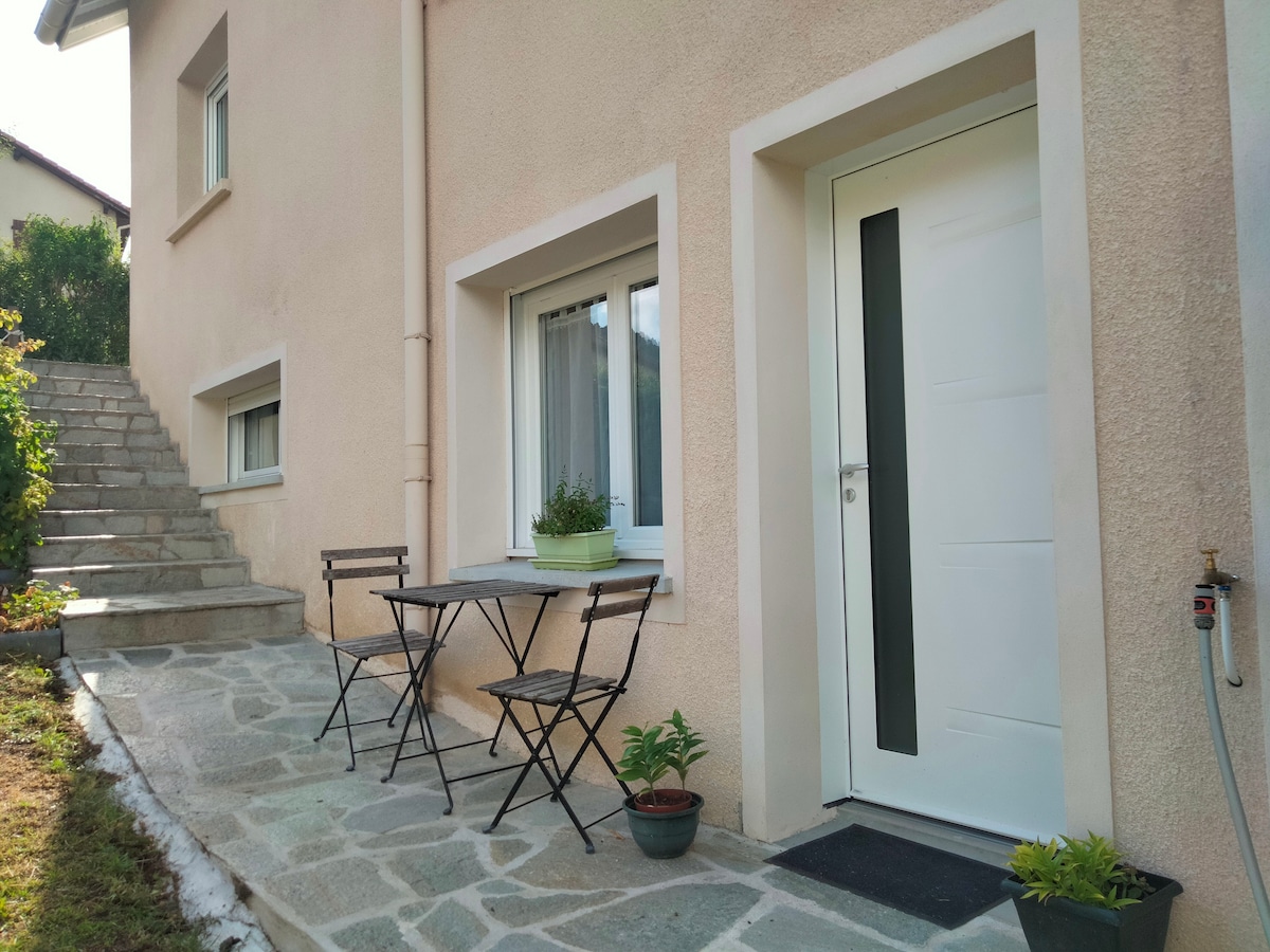 Нова студія площею 20 м2 на першому поверсі тихої вілли Ceyrat. У вас буде окремий вхід, паркувальне місце (лише для автомобіля) та велика сонячна тераса. Квартира обладнана міні-кухнею, ванною кімнатою з туалетом, двоспальним ліжком у 140, обіднім столом на 2 осіб та невеликим столом. Телевізор/Wi-Fi (надаються простирадла та рушники) Відправна точка ущелини Арт 'єр 2 хвилини: автобуси та магазини 5 хвилин: Zenith/Grande Halle d 'Auvergne.