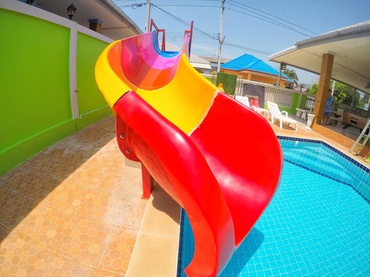 Baan Arthur, тиха і спокійна вілла з басейном, яка дозволить вам відчути себе як удома. > Приватна вілла для сім 'ї та друзів, яким дійсно потрібне тихе місце для розміщення (до 10 гостей). > Приватний басейн з гіркою та захисним обладнанням для дітей. > 55-дюймовий смарт-телевізор і караоке. > 2 в 1 басейн та повітряний хокей. > Доставка морепродуктів (як свіжих, так і приготованих) + доставка їжі + доставка 7-11. > 5 хвилин їзди до 7-11, 20-25 хвилин їзди до пляжу Чаам. > Цілодобова підтримка від команди господарів.