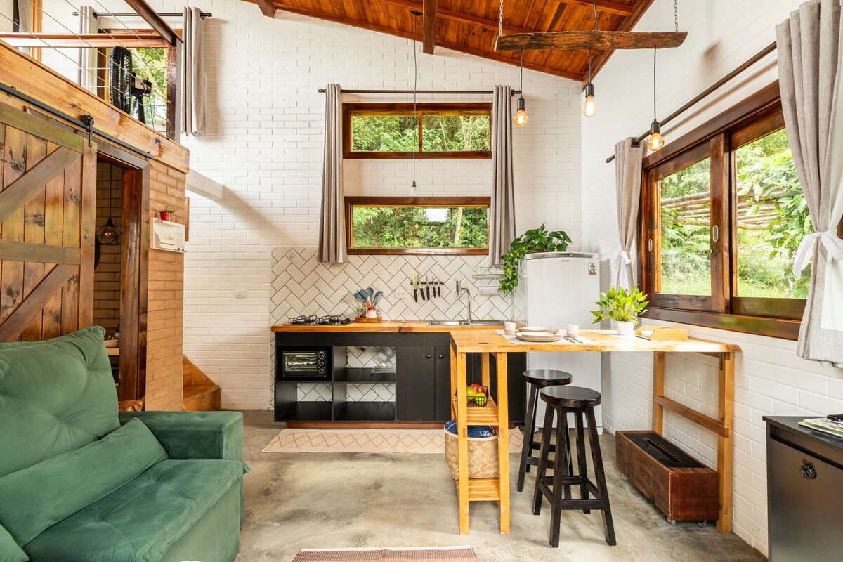 Відкрийте для себе чарівність Серра-да-Мантікейра в цьому будиночку, спроектованому так, щоб ви могли споглядати схід сонця, не встаючи з ліжка. Відпочиньте в нашому спа-салоні з підігрівом, спостерігайте за зірками над головою та гойдалками. У хатині є інтегрована кімната з затишним ліжком queen-size. У вітальні/кухні суперкомфортний футон розміщує ще двох гостей, що робить враження ідеальним для сімей. У помешканні також є стежки та невеликі водоспади.