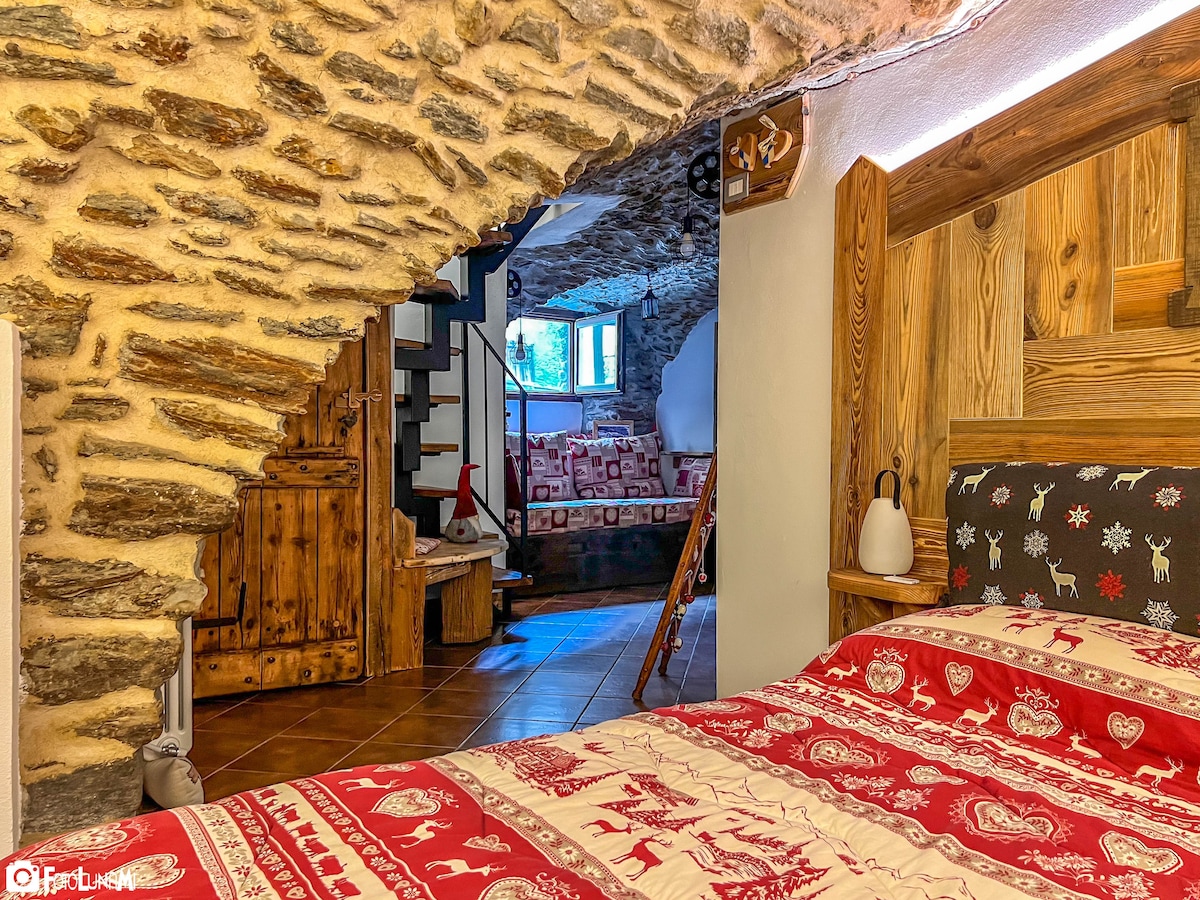 Monolocale con grotta situato al PT di una graziosa casa indipendente di montagna. Arredamento nuovo in stile rustico. Cucina dotata di piano cottura a gas, frigo, fornetto e tutte le stoviglie necessarie per mangiare e cucinare. Zona giorno dotata di tv led e letto matrimoniale. Leggermente appartato è presente un letto singolo con armadio. Bagno con doccia dotato di finestra. Su richiesta sono disponibili gratuitamente: culla per neonati (0-3anni) e seggiolone pappa. No animali.