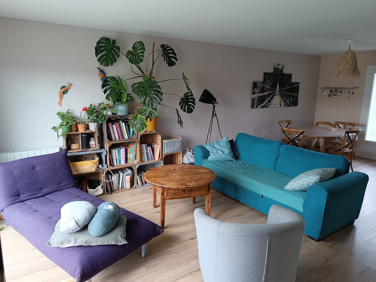 La maison a un accès de plain pied dans un endroit paisible. Sans prendre de voiture, vous y trouverez la nature, des départs de randonnées en forêt. Vous êtes à moins de 5 mn d'une zone commerçante et à 10 mn du centre ville de Périgueux. Vous pourrez visiter la "venise verte" qu'est Brantôme. Pendant votre séjour, j'occuperai parfois le bas de la maison avec une entrée indépendante à la votre. Vous pourrez profiter d'un barbecue, hamac, transats... le tout sur un terrain clos de 1500 m²