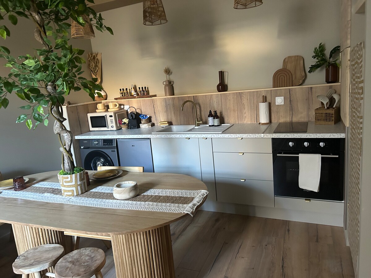 Приходьте і насолоджуйтеся моментом спокою в цьому колишньому виноробному та фермерському будинку, повністю відремонтованому в центрі Маконнаї, розташованому в 5 хвилинах від виїзду з плати A6 Mâcon Nord. Насолоджуйтеся комфортною площею 40 м2. Кондиціонер, повністю обладнана кухня, спальня з 140 ліжками з електричною пам 'яттю, ванна кімната з італійським душем, телевізор, приватна тераса, безпечна та закрита парковка, 2-місний диван-ліжко...
