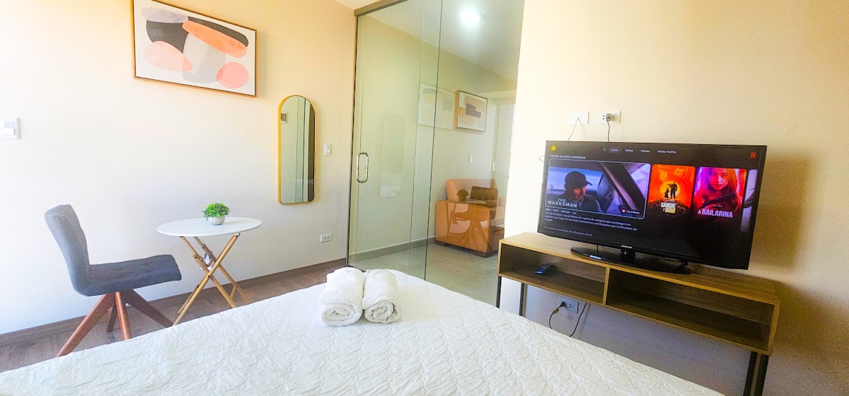 У НАЙКРАЩОМУ РАЙОНІ КОЧАБАМБИ є все! Зручні білі подушки в готелі, простирадла, ковдри, найшвидший доступ до Інтернету, добре обладнана кухня, 2 телевізора з каналами з усього світу, пральня, чиста та дезінфікована кухня, спальня та ванна кімната. Прилади з нержавіючої сталі. А в кондомініумі є всі зручності, такі як басейн Tempered, кафетерій, велике патіо, магазин, 360-відпочинок на Кочабамбу, служба таксі, безпека 24/7. Він знаходиться в 10 хвилинах їзди від найвідвідуваніших місць міста!