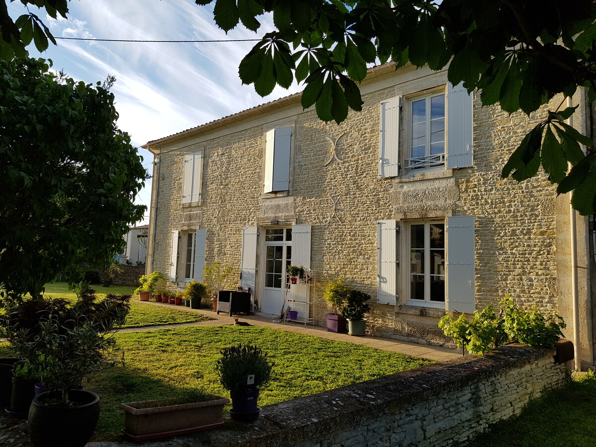 Idéalement situé entre Niort et Poitiers et à moins de 5 min d'une sortie d'autoroute . L'endroit idéal pour une halte ou tout simplement un moment de détente à la campagne. Chambre à l'étage de notre habitation avec entrée indépendante, comprennant 1 lit de 180 et 1 lit de 90 ou 3 lits de 90. A disposition bouilloire, cafetière à grain, micro-onde, petit réfrigérateur (17l) pour préparer vos petits déjeuners. Biscuit local en guise de bienvenue. Parc de jeux et terrain de boules à proximité