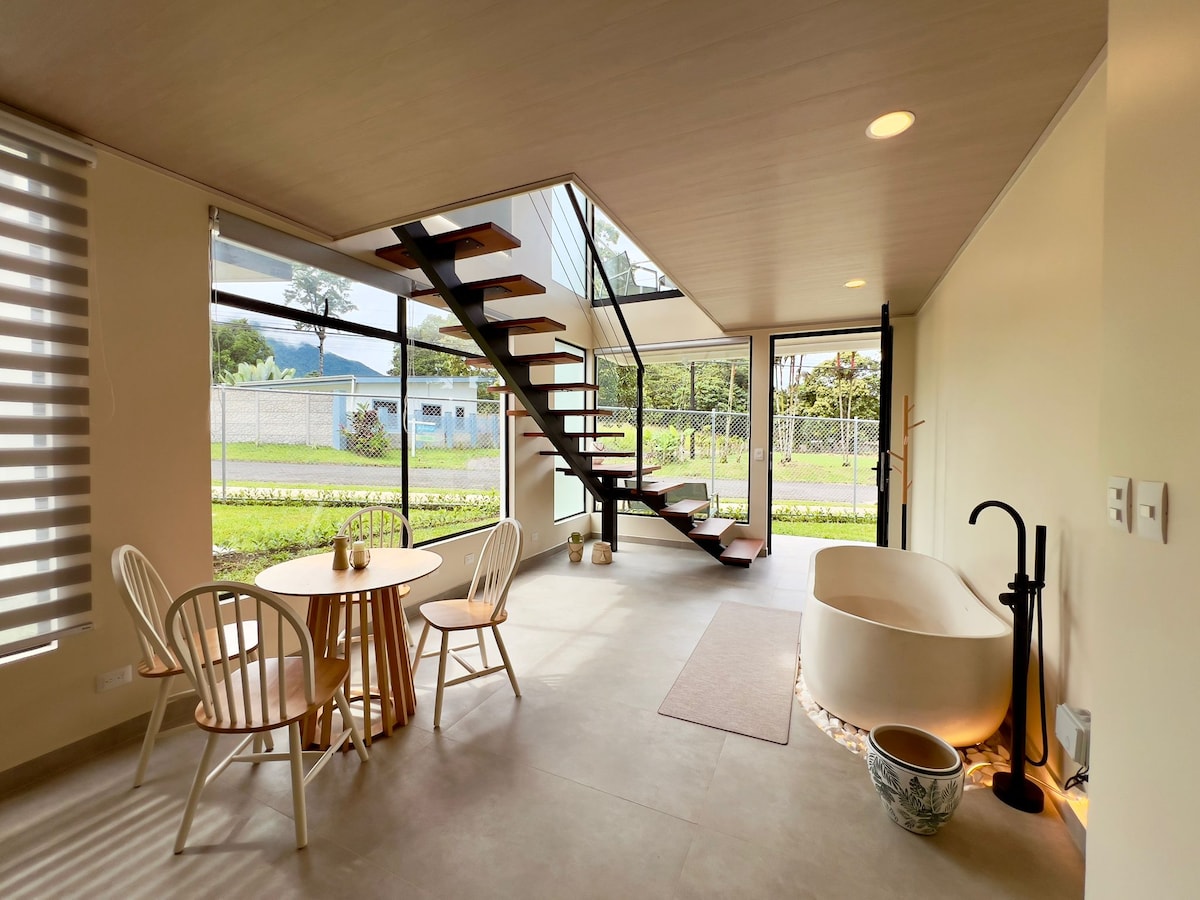 Помешкання, щоб відпочити від рутини та познайомитися з природою, має сучасний дизайн з теплим декором, оточений природою, де можна спостерігати за багатьма птахами, гарним видом на вулкан, балкон, терасу, освіжаючий басейн та приватне джакузі. Чудове місце для пар, друзів або тому, щоб ви могли працювати дистанційно. Стратегічне розташування поблизу всіх основних заходів і всього за 2,5 км від центру міста Ла-Фортуна та за 1 км від водоспаду Ла-Фортуна.