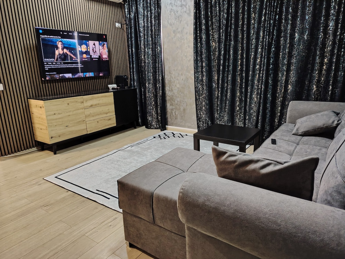 Lovely, quite and sunny apartment. Brings a pleasant and relaxing feeling in a softly atmosphere. Welcome you heartlly our dear guest. Accompanied by a free minibar, enjoy a cinematic evenings with Netflix, Amazon prime, Youtube premium. Television in multilanguage at Focus Sat. Kids have a recreative playing and relaxing space. Following apartment is suitable for: • 2 adults + 2 or 3 children • 3 adults • 2 couples Travelers by car has dedicated private parking for free.