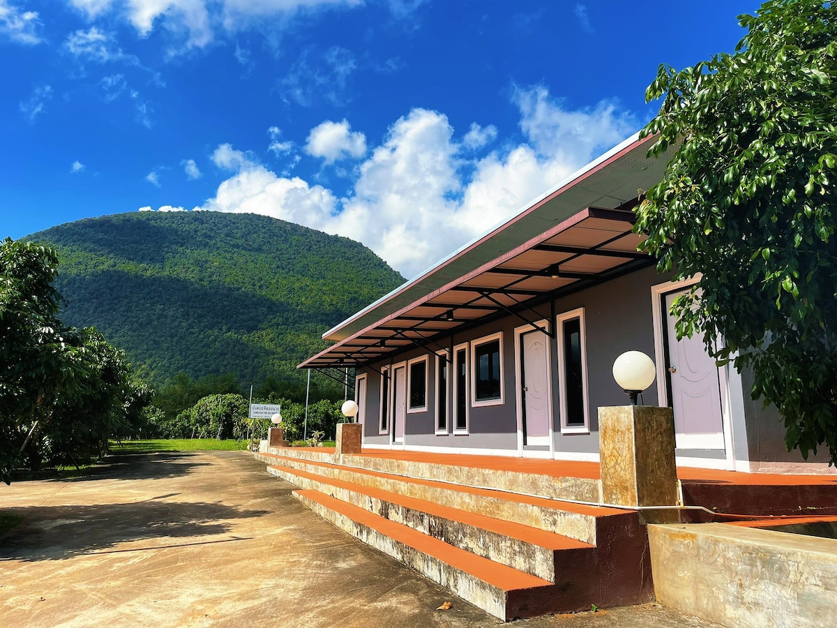 Цілий будинок, заміський будинок з 3 спальнями (3 двомісні, 1 одномісна), 2 ванними кімнатами та великим приватним балконом з видом на гори. Кожен будинок спокійний і має окремий вхід. Всього в 5 хвилинах ходьби від головного міста Чіанг-Дао. Простора земля, де можна відпочити на природі. Насолоджуйтеся захоплюючим видом на гору Чіанг-Дао з балкона, але в декількох хвилинах ходьби знаходиться центр цього невеликого міста, де можна насолодитися кафе, вуличною їжею та місцевими ресторанами.