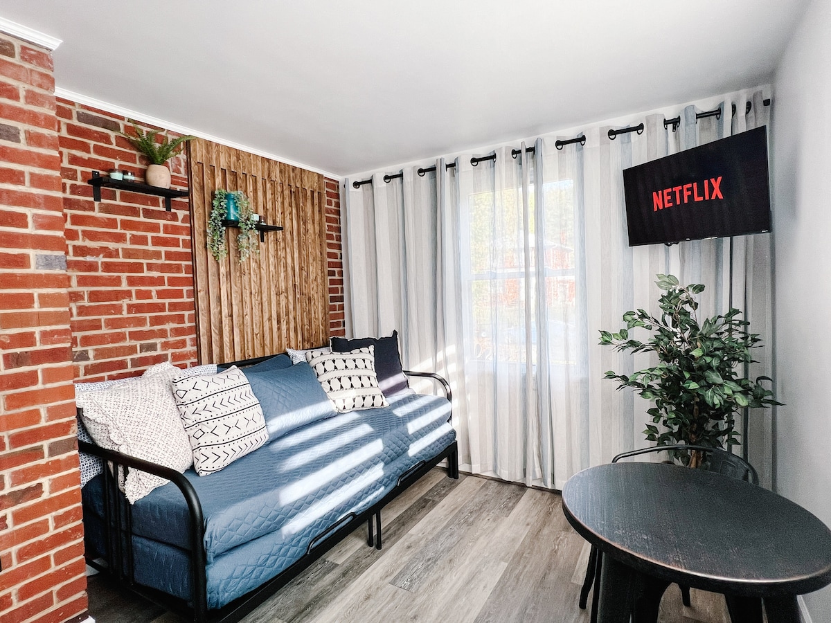 Ласкаво просимо до Yellow Tiger's Den – приватного затишного гостьового дому, наповненого сміливими кольорами, продуманим дизайном і атмосферою Річмонда. Розташована над спіральними сходами для повної конфіденційності, ця сонячна студія поєднує в собі сучасний стиль середини століття з підібраними жовтими акцентами, затишним приватним патіо та всім необхідним для комфортного перебування. Розташований в історичному районі Річмонда, Беттері-Парк, ви знаходитесь за кілька хвилин від зростаючої кулінарної сцени міста, місцевих пам’яток і зручного доступу до автомагістралі.