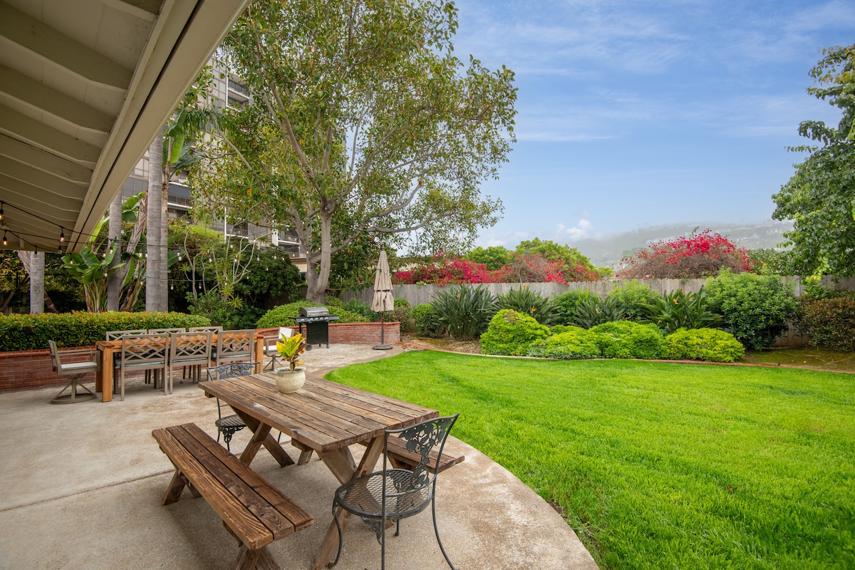 Котедж із секвої, розташований у 3 кварталах пішки від прекрасного пляжу Ла-Хойя-Шорс. Великий затишний задній двір із патіо, гідромасажною ванною, душем на відкритому повітрі та красивими рослинами й деревами. Поруч із магазинами та ресторанами, але в тихому місці. У 2025 році 45 % наших бронювань були зроблені постійними гостями.