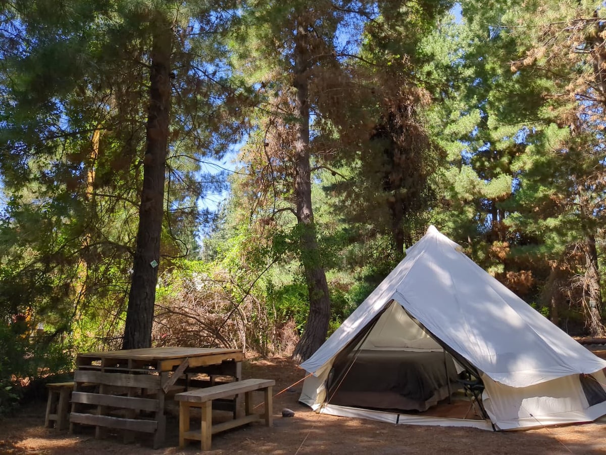 Alojamiento en sector de Camping. Tienda de campaña con Cama americana de 2 plazas, ropa de cama con almohadas, sabanas y cubre almohadas de polar para noches frias. Toallas y articulos de ducha incluidas. Electricidad en su interior para recargar tus dispositivos. A 30 metros de sector de quincho equipado con refrigerador, baño seco, ducha con agua caliente y cocina full en espacios compartidos. - Wifi solamente en sector de quincho. - Estacionamiento gratuito a metros de la tienda. -
