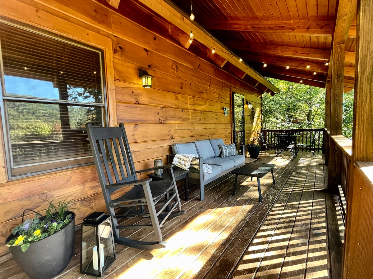 Справжній зруб, розташований на Чорній горі неподалік від пам 'яток. Спокійне та тихе розташування поруч із Чімні-Рок (15 хвилин) та центром міста Блек-Маунтен (25 хвилин). *Дорога відкрита для місцевих жителів. GPS може спробувати провести вас довгим шляхом. Насолоджуйтеся заходом сонця з гідромасажної ванни, обідайте надворі під навісом дерева, відпочивайте біля каміна або насолоджуйтеся чашкою кави на веранді. Розважайтеся з підбіркою DVD-дисків, слухайте музику на динаміці Bluetooth або грайте в гру. Дозволено перебування з тваринами
