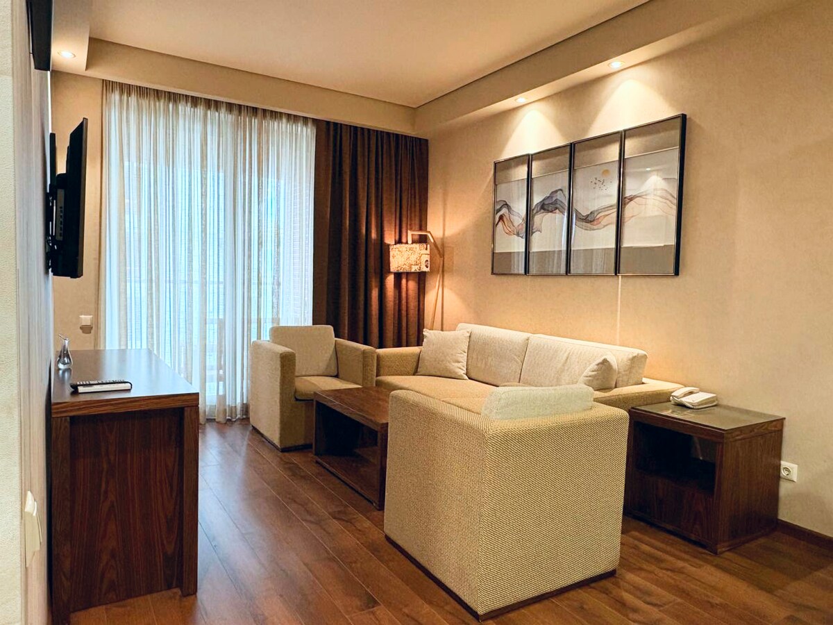Студія з терасою на 5-му поверсі готелю преміум-класу Dreamland Oasis для 4 осіб. Квартира розташована на 1-му узбережжі в тихому мальовничому місці, в 10 хвилинах їзди від Батумі. З тераси відкривається вид на море, гори, евкаліптовий гай, парк Мтірала та Ботанічний сад. Зелені зони, басейни, дитячі майданчики та багато інших розваг створять незабутню атмосферу райського відпочинку для вас і ваших дітей. Розмір студії: 35 метрів