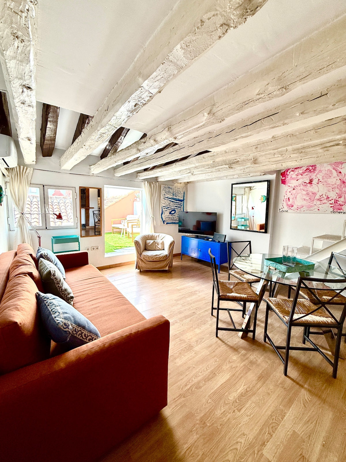 Happy to share this unique attic Duplex in the heart of Malasaña featuring a bedroom that expands into a terrace Full kitchen, large living room and special views from the terrace to enjoy Madrid. Bed is 150cm x 200cm Bonus: there is a second outdoor shower in the terrace (you will enjoy it more than you think!) Important: Floor 3 (no elevator) Located within walking distance of Gran Via and Chueca, in the vibrant area of Malasaña