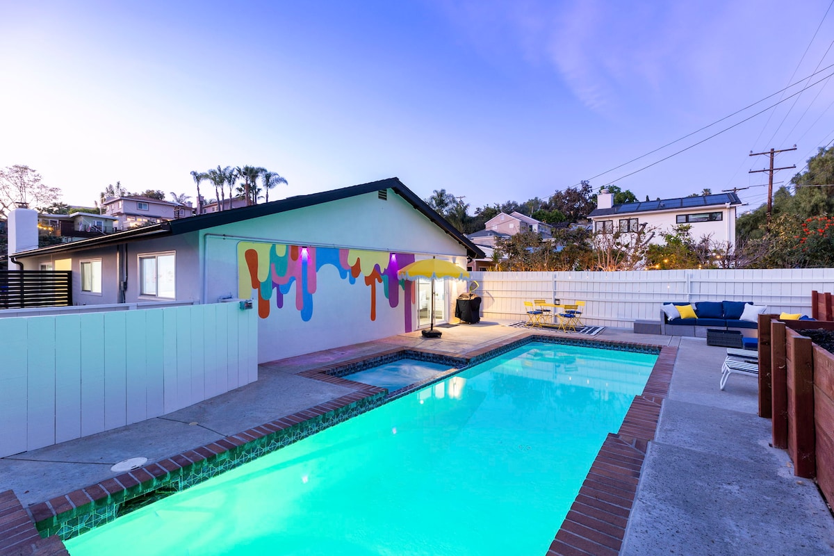 Знайдіть місце мрії своєї сім 'ї в Сан-Дієго! Наш затишний будинок розташований на тихому пагорбі, пропонуючи усамітнення та дивовижні краєвиди на захід сонця. Плавайте в нашому басейні цілий рік (з підігрівом за додаткову плату), смажте зефір біля вогнища та готуйте разом смачні страви. Маючи 3 спальні та 2 ванні кімнати, він ідеально підходить для сімей, де можуть розміститися до 9 гостей. Крім того, ми близькі до всіх найкращих пам 'яток. Бажаєте провести відпустку, яку ви завжди пам 'ятаєте? Надішліть нам повідомлення, щоб це сталося! 🌅🏠 У нас є 3 зручні ліжка, які можуть