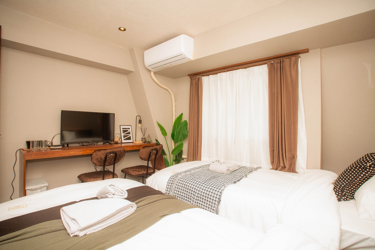 ■Traditional x Modern Home theater and bathroom with foggy glass are provided in the atmosphere of Japanese bookstores in old times (the unit's design concept). ■Room Details 1 floor rental (4F) / 90m2 3 bedrooms (4 single beds, 1 queen *futon will be provided from 7 guests) ■Access *approx. Nipponbashi Station (3 min) Dotonbori (5 min) USJ (40 min) Kyoto (1 hour) Enjoy your private stay in the middle of the city.
