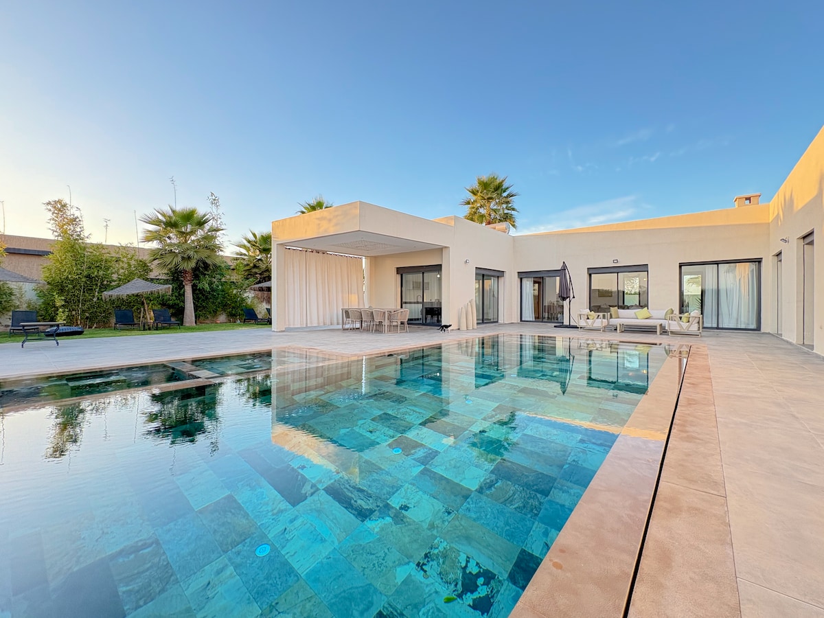 Велика (220 кв. м) вілла, спроектована відомим архітектурним Чарльзом Боккаррою. Приватний сад з басейном з підігрівом. Вілла розташована в межах безпечної резиденції, де є тенісний корт, сади Анадалу, клубний будинок. На території є покоївка, щоб вирішити всі завдання в помешканні (ліжка, прибирання тощо). Можливість приготування їжі. Вілла розташована в 14 км від центру Марракеша і всього в 5 км від Royal Golf Club і Amelkis Golf.