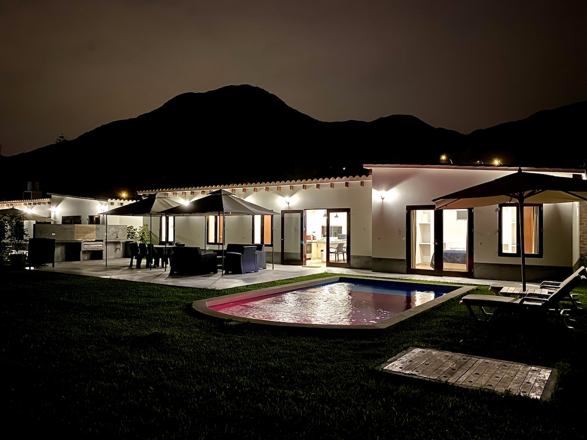 Насолоджуйтеся парою або сім 'єю поруч із природою і приблизно в 1 годині їзди від Ліми. Ми поєднуємо сільську та затишну концепцію. Amanece затишний звуками природи, і, якщо ви виберете, тримайте вас на зв 'язку з зовнішнім світом Насолоджуйтеся незабутніми моментами, готуючи багаття або гриль, відпочиваючи у басейні, відпочиваючи з заходом сонця та вітром, що дме дерева, або читання хорошої книги з келихом вина. У нас можна перебувати з домашніми тваринами. Максимум 8 гостей (гості перевіряють вартість).