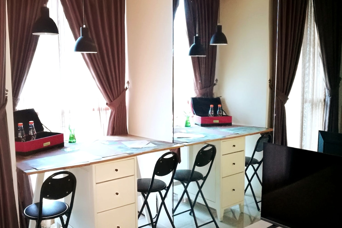 Затишна кухня 1 BR і кухня в лагуні Гранд-Камала, розташована над торговим центром Lagoon Avenue Mall у Бекасі , поруч із платними воротами Becakayu і Bekasi Barat і станцією LRT. Дуже близько до інших торгових центрів у Бекасі . З басейном, тренажерним залом і кишеньковим садом всередині вежі квартири, помешкання ідеально підходить для відпочинку на вихідних за межами Джакарти або для ділових поїздок у Бекасі та Караванзі. Ми прагнемо, щоб гості почувалися комфортно, залишаючи кімнату вільною між кожним перебуванням для більш ретельного прибирання