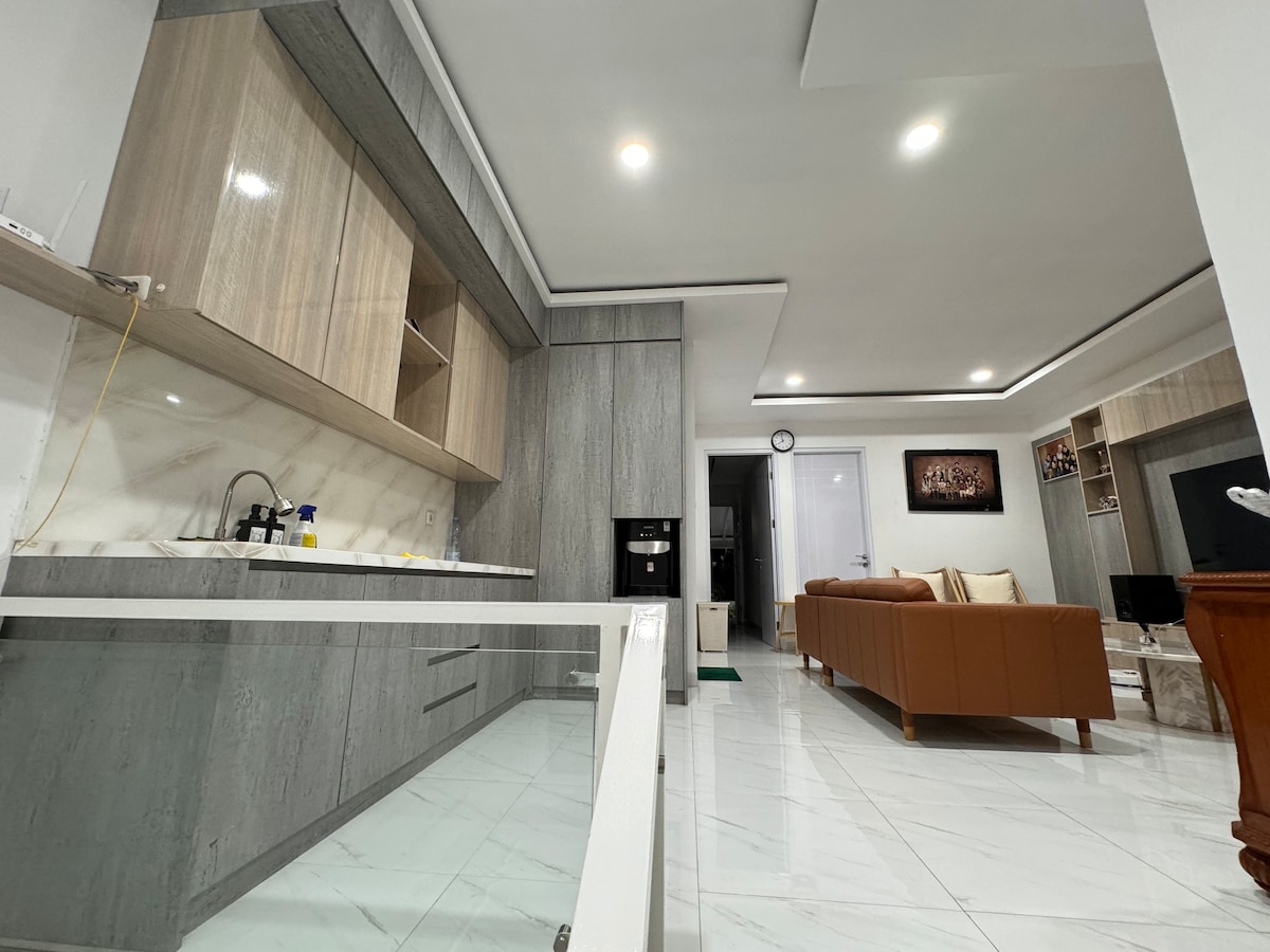 Супер затишна та чиста квартира з 2 кімнатами, з невеликою атмосферою узбережжя та гарним краєвидом. Стратегічне розташування, оскільки воно розташоване поруч із платними воротами Пастера, однією з головних доріг у Бандунгу. Є одне ліжко розміру «queen-size», 1 ліжко вгору і вниз та 1 диван-ліжко (місткість на 6 осіб) У нас є всі зручності, такі як: смарт-телевізор, необмежений Wi-Fi, кондиціонер, водонагрівач, електрична плита, мікрохвильова піч, галон води для пиття, міні-кухня, фен, праска, рушник (4 рушники) тощо.